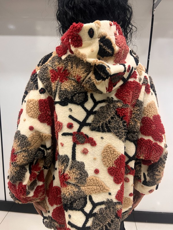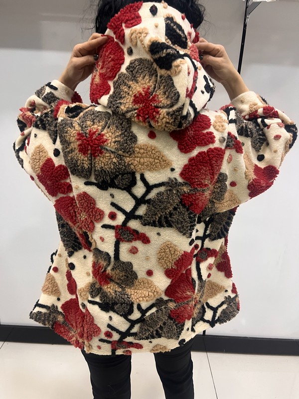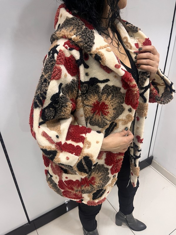 İtalyan üretim, keçe dokulu kumaşıyla öne çıkan bu desenli kadın kaban; rahat kalıbı ve modern görünümüyle günlük şıklığın vazgeçilmez parçalarından biridir. Astarsız yapısı sayesinde hafif bir kullanım sunarken, tok duruşu ile serin havalarda ideal konfor sağlar. Kapüşon detayı ve dikkat çekici dokulu deseniyle kombinlere karakter kazandırır.