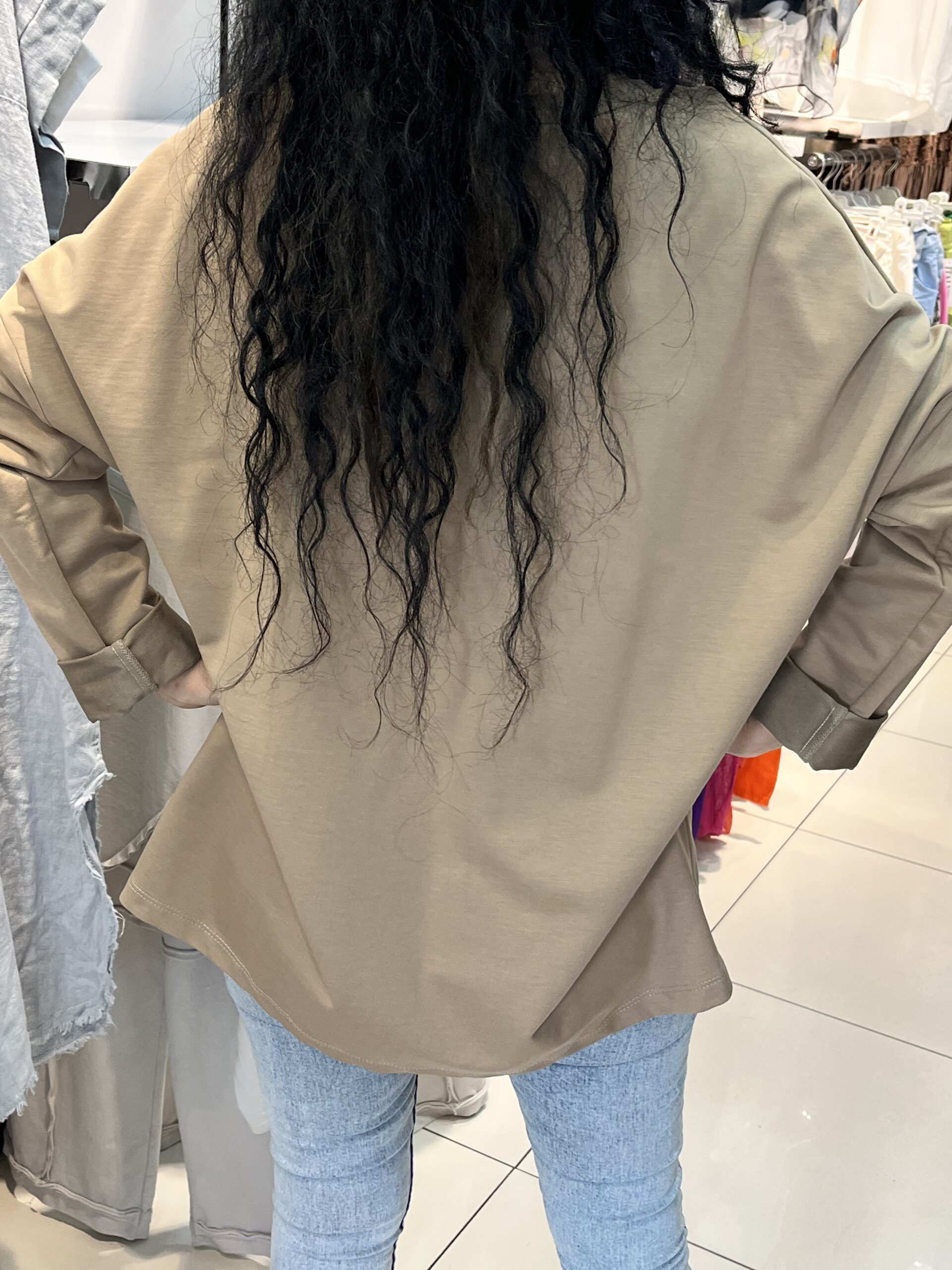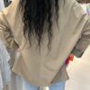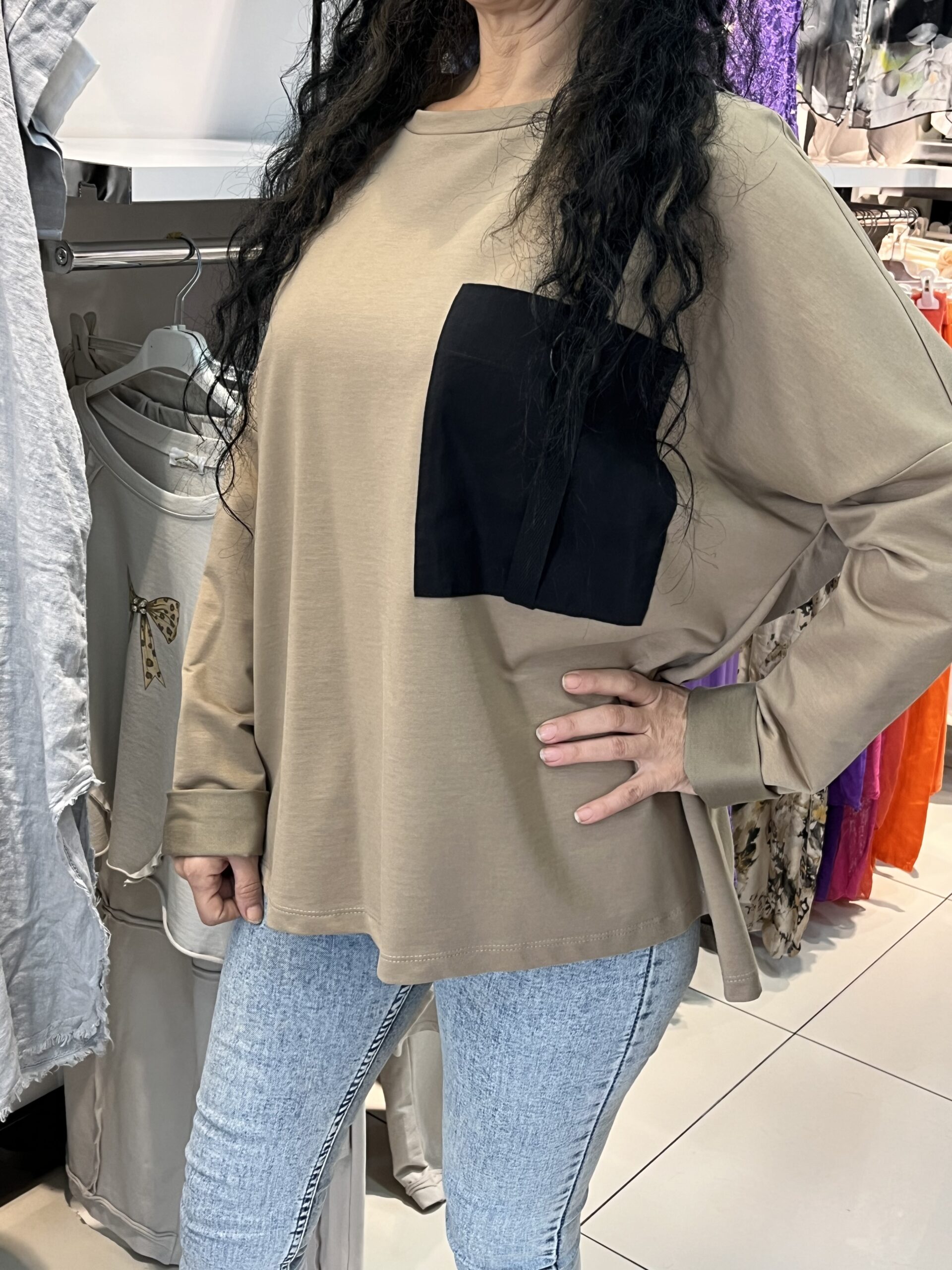 Bej tonunun sıcaklığı, büyük siyah cep detayıyla modern bir kontrast oluşturur. Rahat kalıbı ve yumuşacık kumaşı sayesinde gün boyu konfor sağlar.